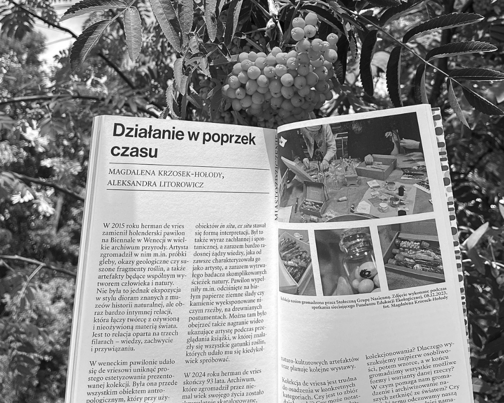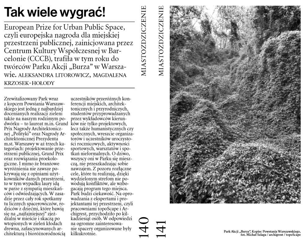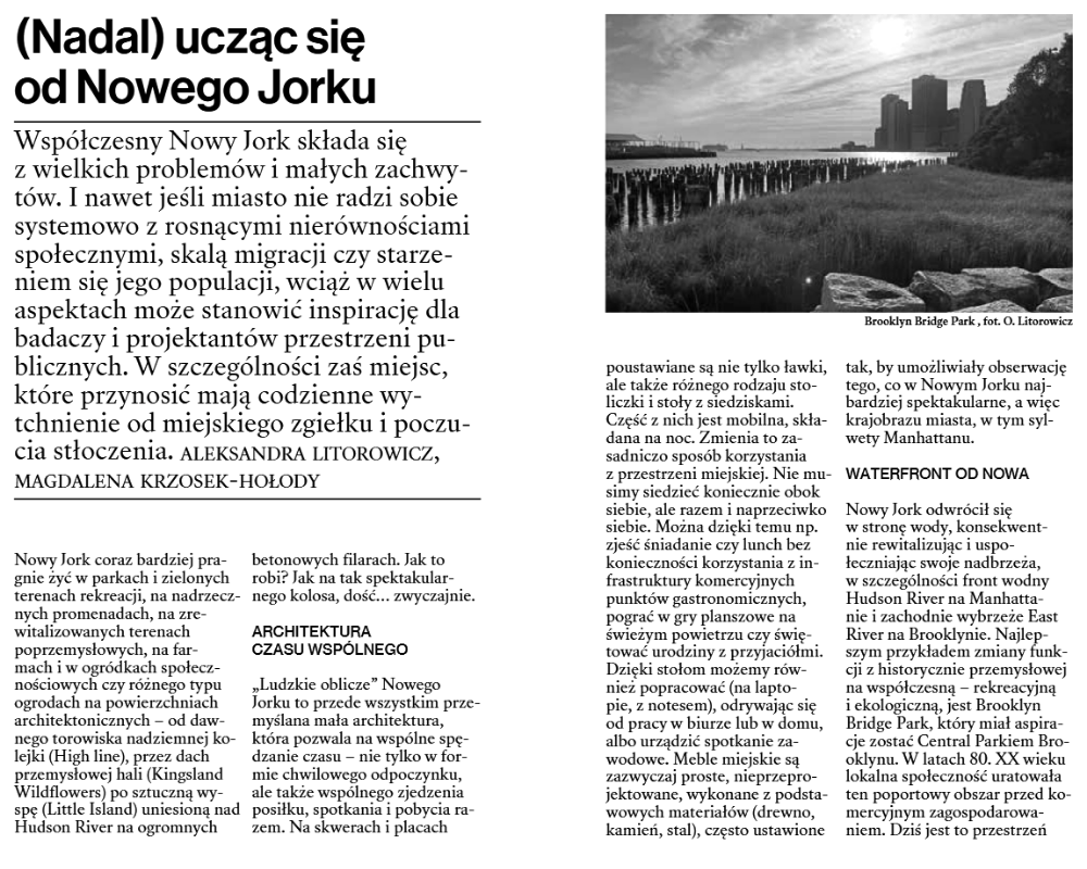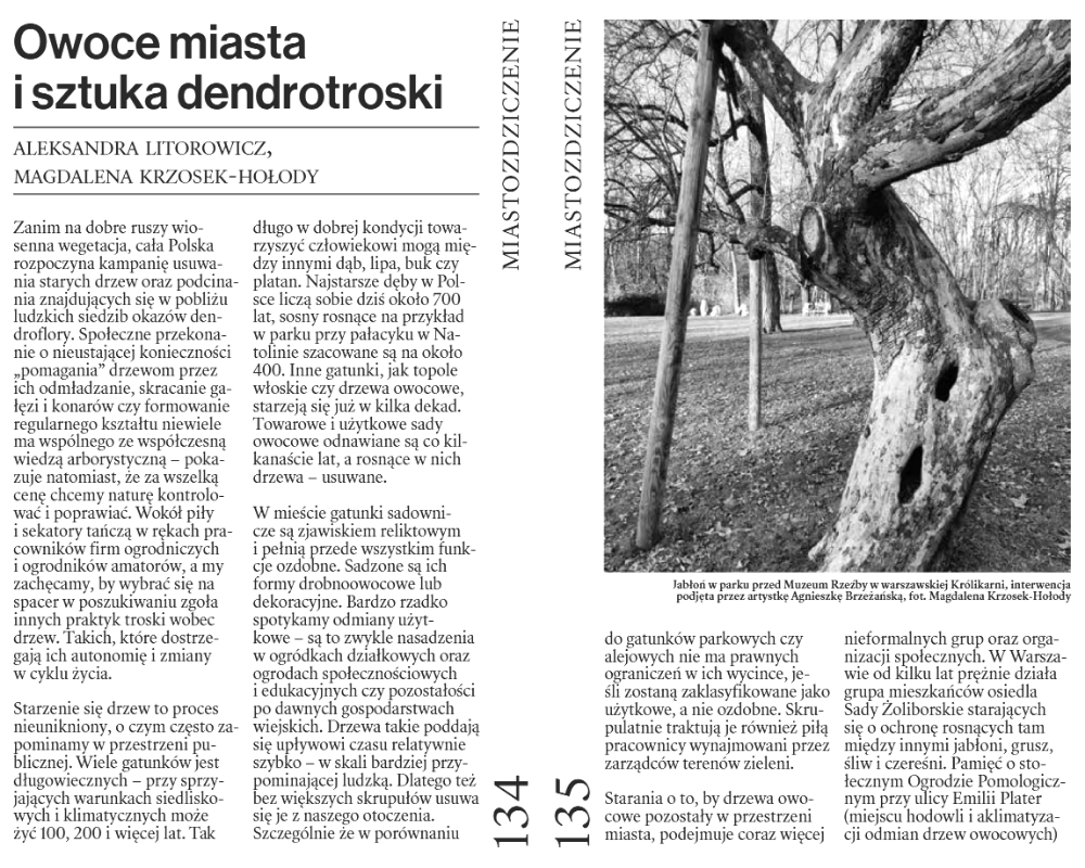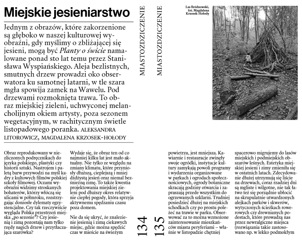 nr #149 „Kultura dla Natury” (ss. 140-143), nr #154 „Działanie w poprzek czasu” (ss. 182-185), nr #156 „(Nadal) ucząc się od Nowego Jorku” (ss. 140-145), nr #157 „Miejskie jesieniarstwo” (ss. 134-137), nr #159 „Tak wiele wygrać!” (ss. 140-145), nr #160 „Owoce miasta i sztuka dendrotroski” (ss. 134-137), nr #161 „Pochwała dzikości i czas nieużytków” (ss. 166-169), nr #162 „U-lotna przygoda” (ss. 182-185), nr #163 „Liście, liście. Co z wami począć?” (ss. 152-155).