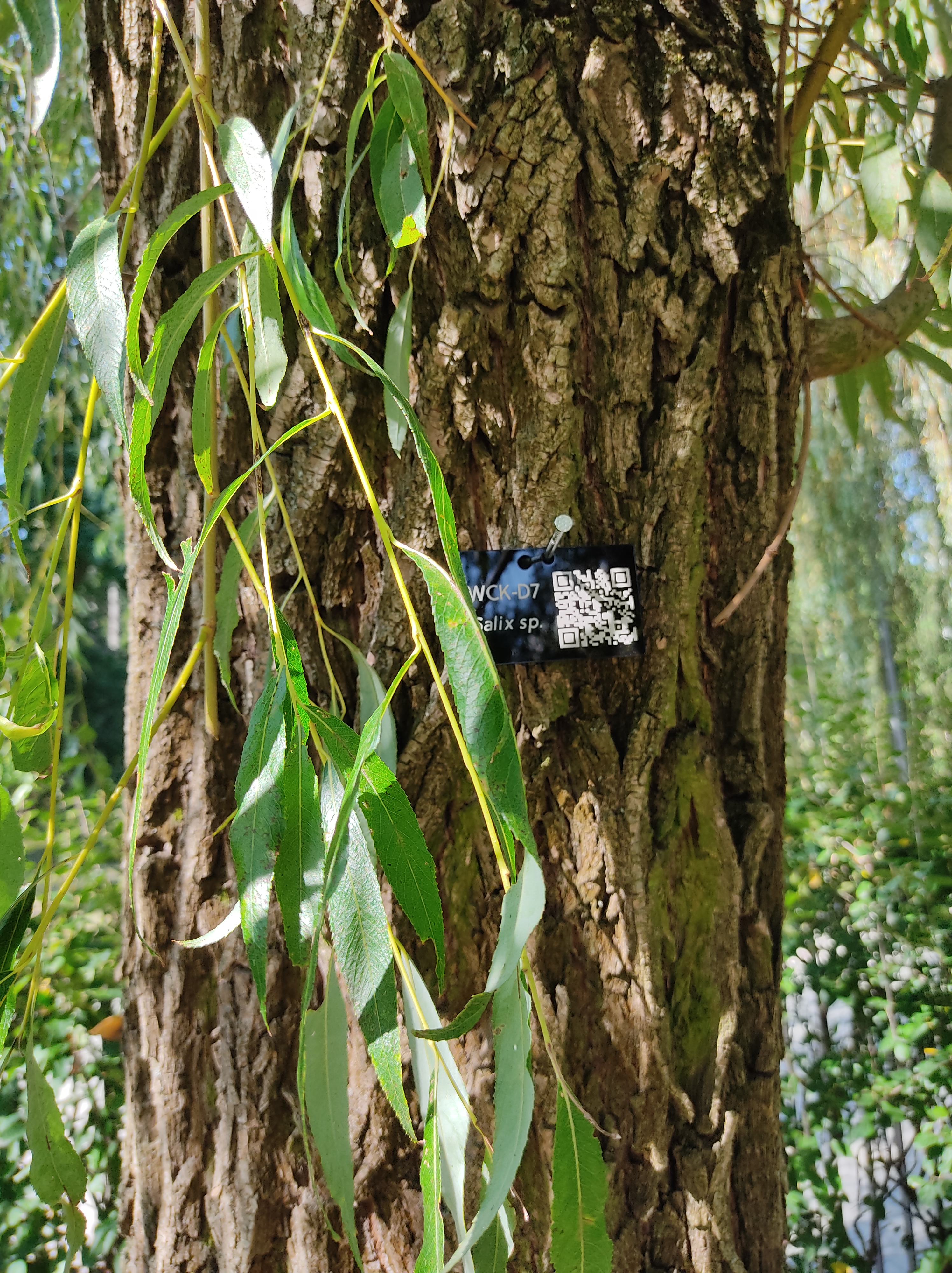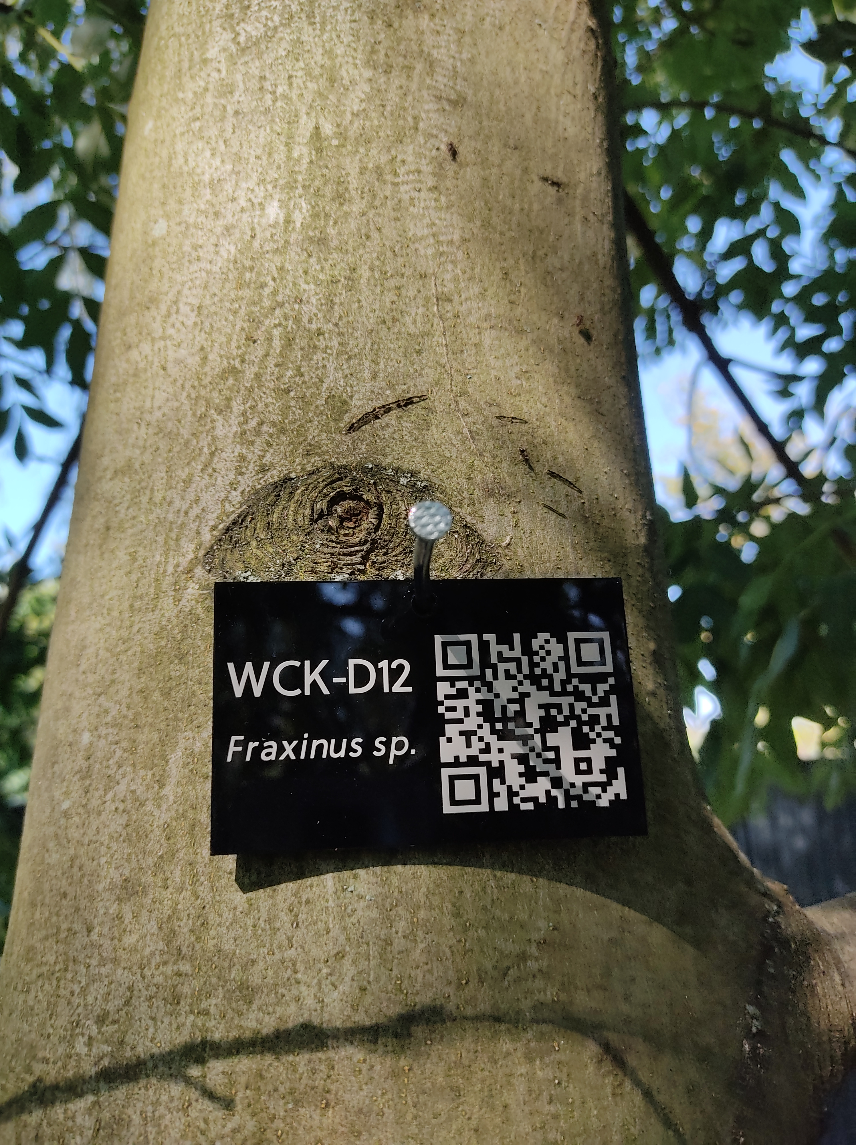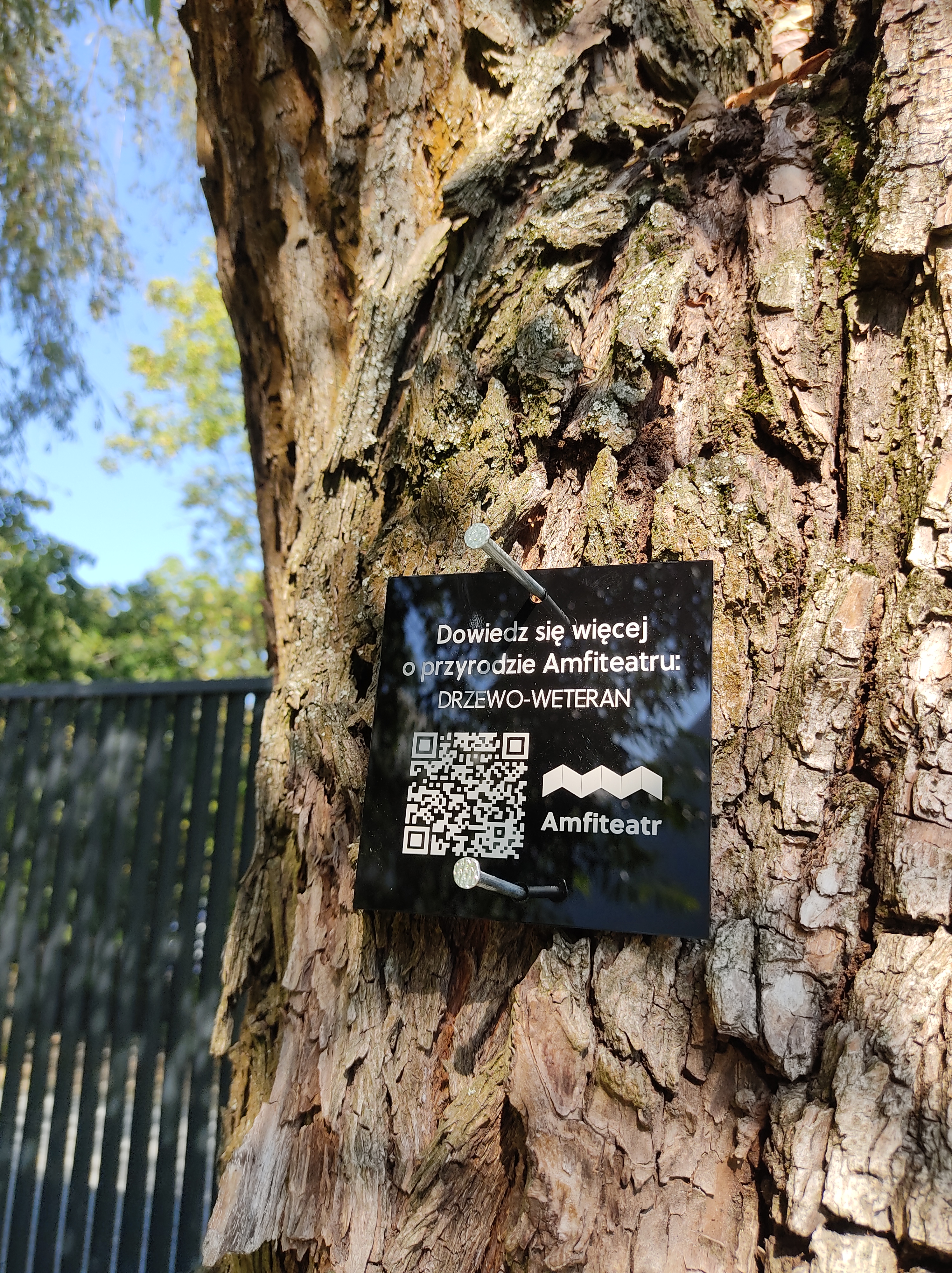 Fot. Przykład arbotagów i tabliczek informacyjnych w terenie zintegrowanych z wynikami inwentaryzacji i programem edukacyjnym, Pracownia Mikroklimaty, 2025.